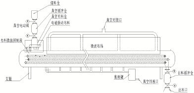 為物料的連續(xù)進出,采用雙級真空擋板閥裝置。該裝置由進料斗、緩沖倉、上真空擋板閥、暫存?zhèn)}、下真空擋板閥、接口等部分組成。同時,在進料端輔以電磁布料裝置,使物料均勻分布于傳送帶上。其動作過程為,初始狀態(tài)上、下真空擋板閥均閉合,物料經進料斗進入緩沖倉,達到一定質量后,上真空擋板閥首先打開,物料進入緩沖倉,然后上真空擋板閥關閉,下真空擋板閥打開,物料經接口進入設備內部,下真空擋板閥關閉,完成一動作循環(huán),準備進入下一循環(huán)。輔助的布料裝置,了間隙時間內,物料的連續(xù)性。真空擋板閥采用電動控制,同時擋板上嵌有食品級硅橡膠密封材料用以真空密封,接口處有導電材料密封微波。