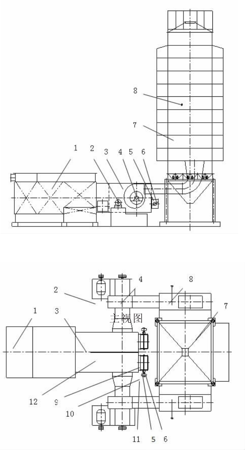1.熱交換器;2.電機;3.混合室;4.主風(fēng)機;5.調(diào)風(fēng)筒;6.風(fēng)門板;7.種子干燥機;8.溫度傳感器;9.閥門軸;10.聯(lián)軸器;11.電動執(zhí)行器;俯12視.混圖合室中間隔板